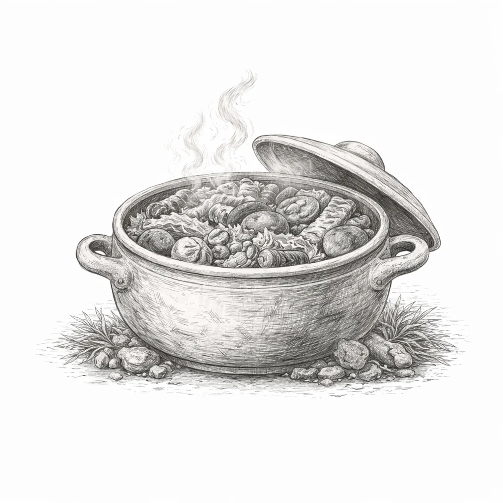 Тушенная в казане с разным мясом, сосисками, колбасками и копченостями собственного производства.