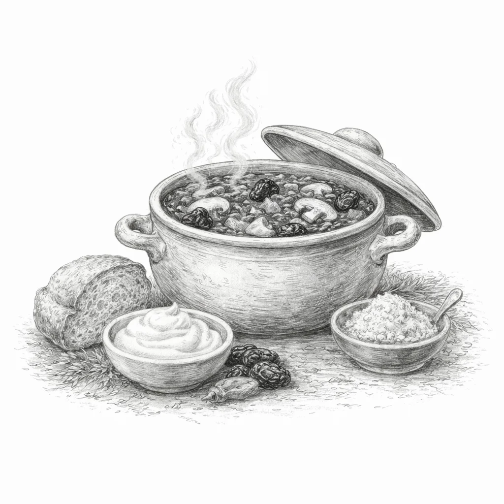 с белыми грибами и черносливом, заправляется зеленью, домашней сметаной или майонезом