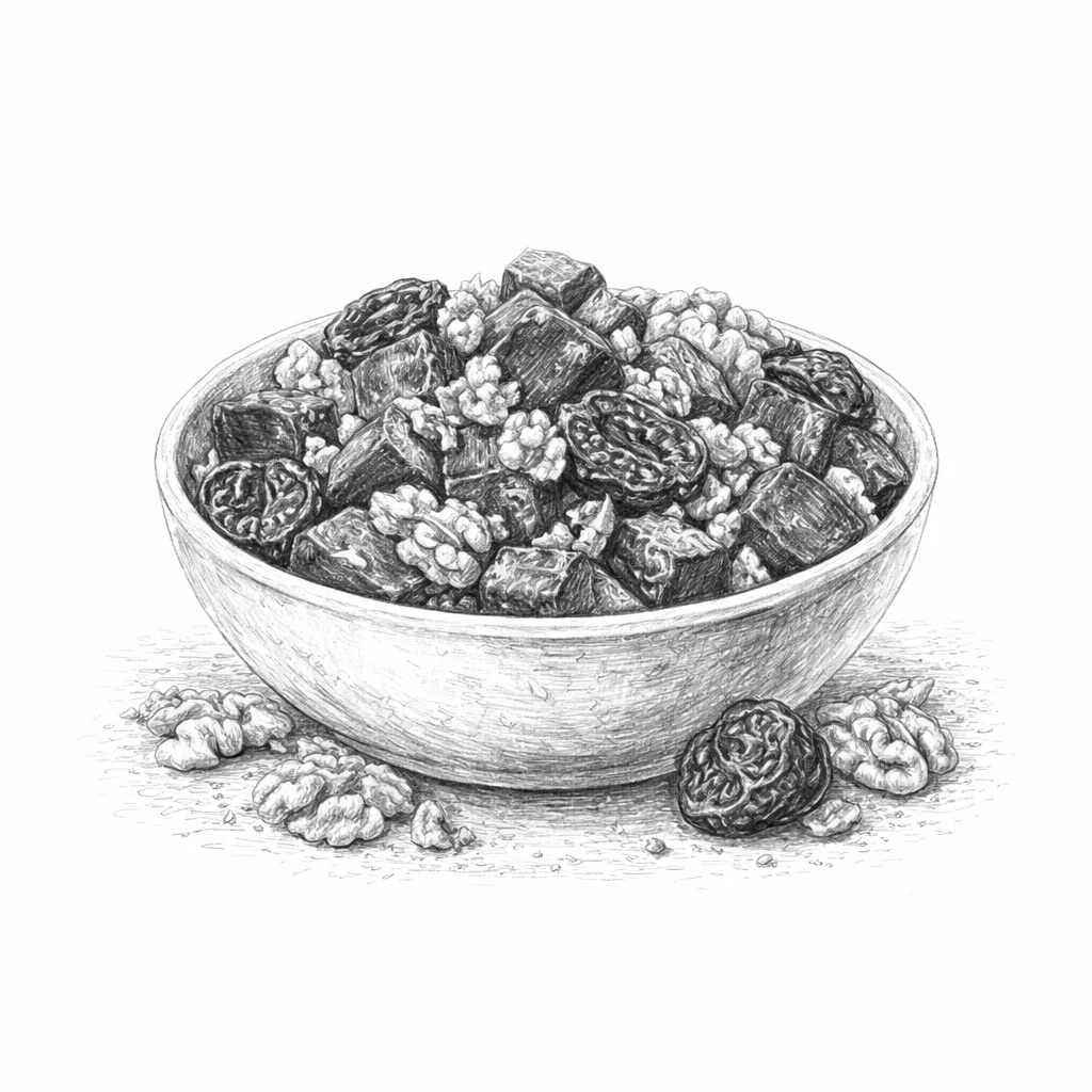 С черносливом, грецких орехов, заправляется домашним майонезом или такой же сметаной.