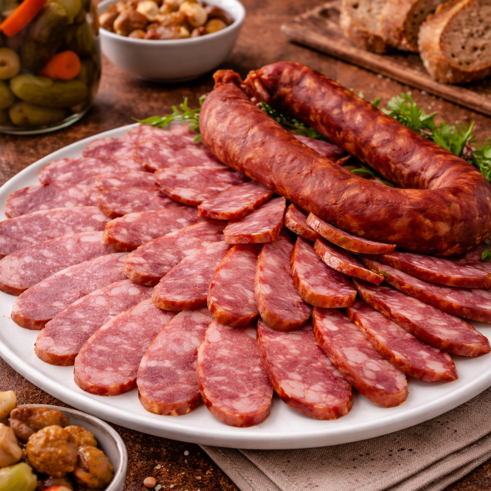 Краковская полукопчёная колбаса — традиционный мясной продукт на основе говядины и свинины. Характерная крупная структура, насыщенный вкус и натуральные специи создают узнаваемый профиль, который ценят поклонники классических колбас.