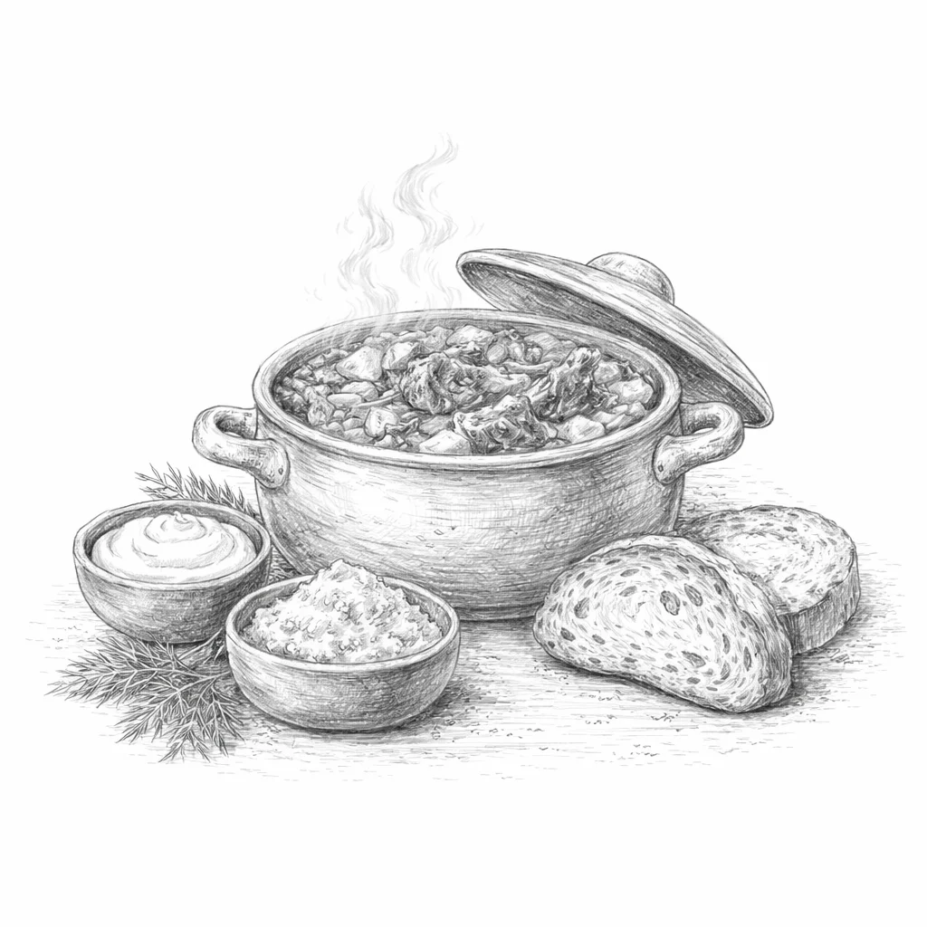 с мясом из лося или местной домашней телятиной или бараниной, свежей капусты, овощей, зелень. Заправляется домашней сметаной или майонезом на выбор