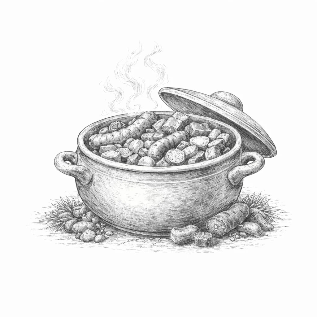 рагу из местных овощей , тушеное с домашними колбасами , сосисками  и копченостями , подается со сметаной или домашним майонезом на выбор