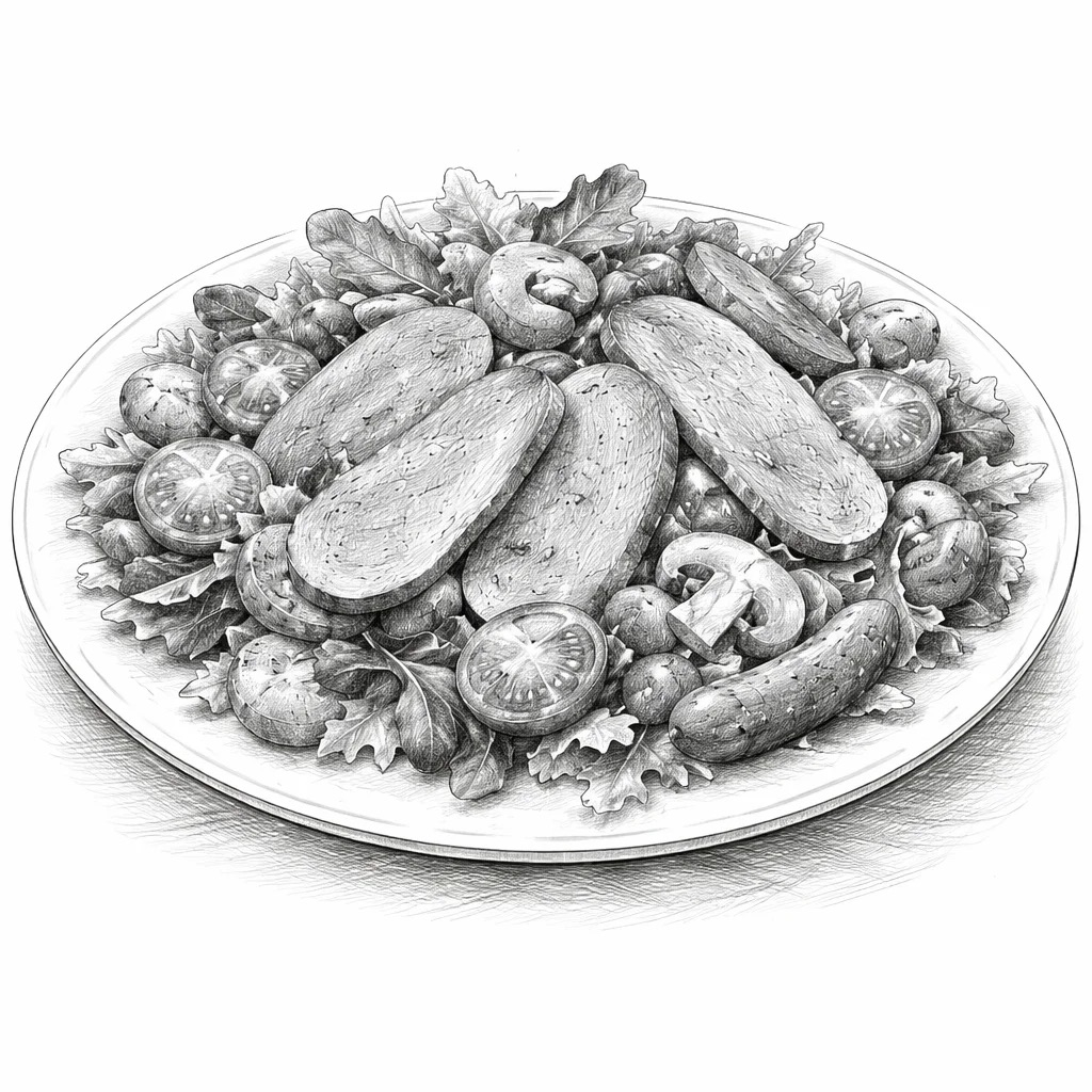 Ломтики отварного языка в сочетании с салатными листьями, грибами, корнишонами, помидорками черри и соусом крем-фреш.