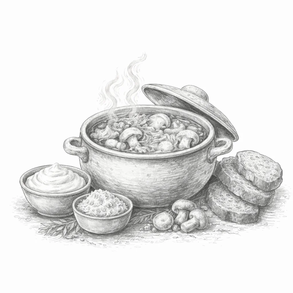 с белыми грибами из печи, томленные в печи щи из серой капусты, репы и лесных грибов, заправляется домашней сметаной или майонезом на выбор