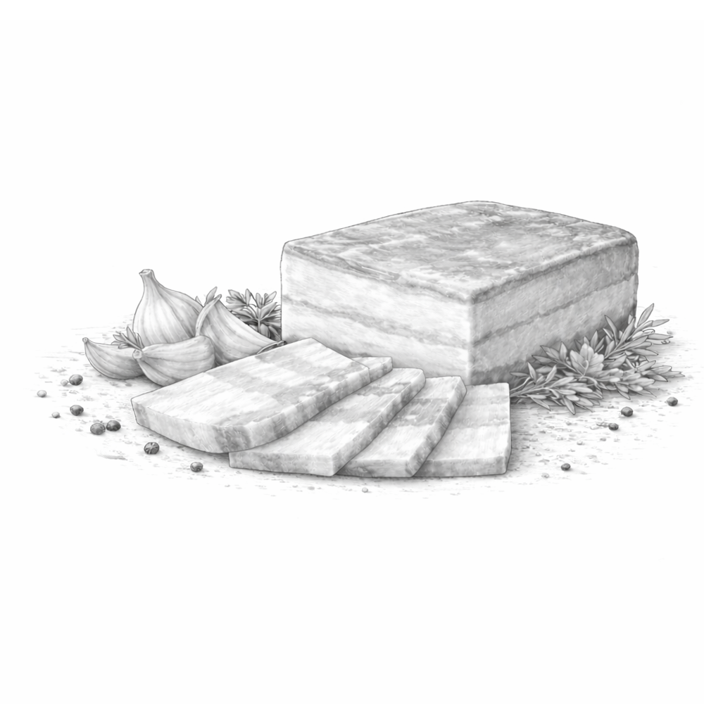 Шпик «Домашний» - это классический мясной продукт из свинины или кабана, приправленный чесноком и чёрным перцем. Натуральный состав и традиционная засолка позволяют сохранить плотную текстуру и насыщенный вкус без лишних добавок.